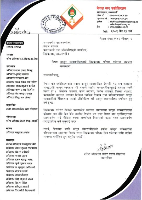 ‘विगतमा जस्तै कानुन व्यबसायीको हकमा कानुन व्यावसायीको परिचयपत्रको आधारमा निर्वाध रुपमा सिंहदरबार परिसरभित्र प्रवेशका लागि साविक ब्यबस्था बमोजिम हुन अनुरोध गर्दछौं,´ बार एशोसिएशनले प्रधानमन्त्री शाहलाई लेखेको पत्रमा भनिएको छ ।