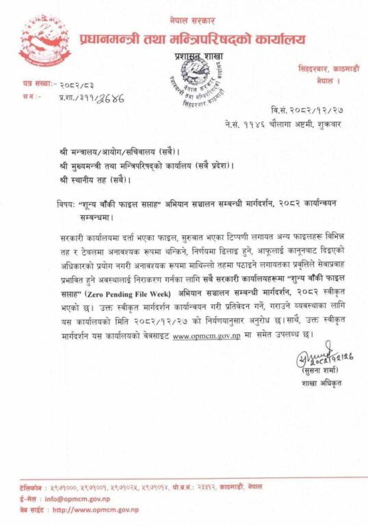 यस्तै, तलै कार्यान्वयन गर्नुपर्ने फाइल अनावश्यक रूपमा माथिल्लो तहमा पठाइने तथा सेवाप्रवाह प्रभावित हुने अवस्थालाई न्यूनीकरण गर्न सबै सरकारी कार्यालयमा शून्य बाँकी फाइल सप्ताह अभियान सञ्चालन गर्न लागिएको स्पष्ट पारिएको छ ।