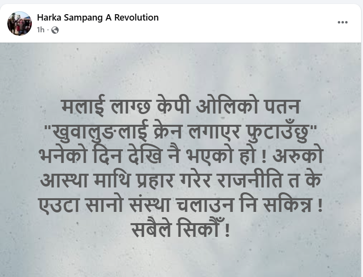 उनले लेखेका छन्, ‘मलाई लाग्छ केपी ओलिको पतन खुवालुङलाई क्रेन लगाएर फुटाउँछुू भनेको दिन देखि नै भएको हो ! अरुको आस्था माथि प्रहार गरेर राजनीति त के एउटा सानो संस्था चलाउन नि सकिन्न ! सबैले सिकौँ !’