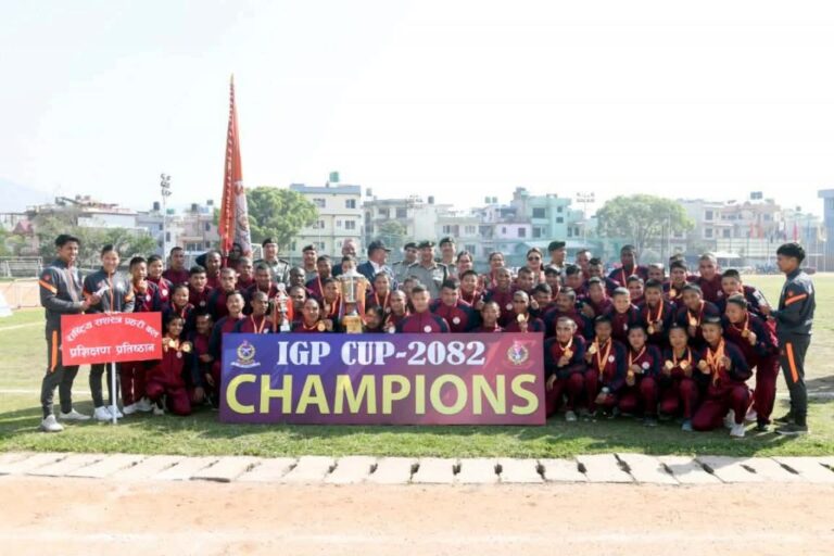 काठमाडौँ, ३० चैत । ‘सशस्त्र प्रहरी महानिरीक्षक कप–२०८२’ को ट्रफी राष्ट्रिय सशस्त्र प्रहरी बल नेपाल प्रशिक्षण प्रतिष्ठान मातातीर्थले जितेको छ ।