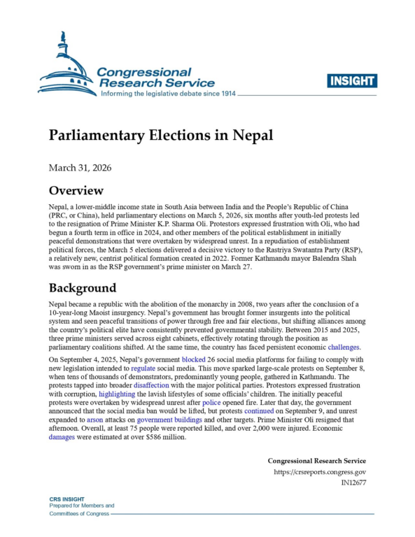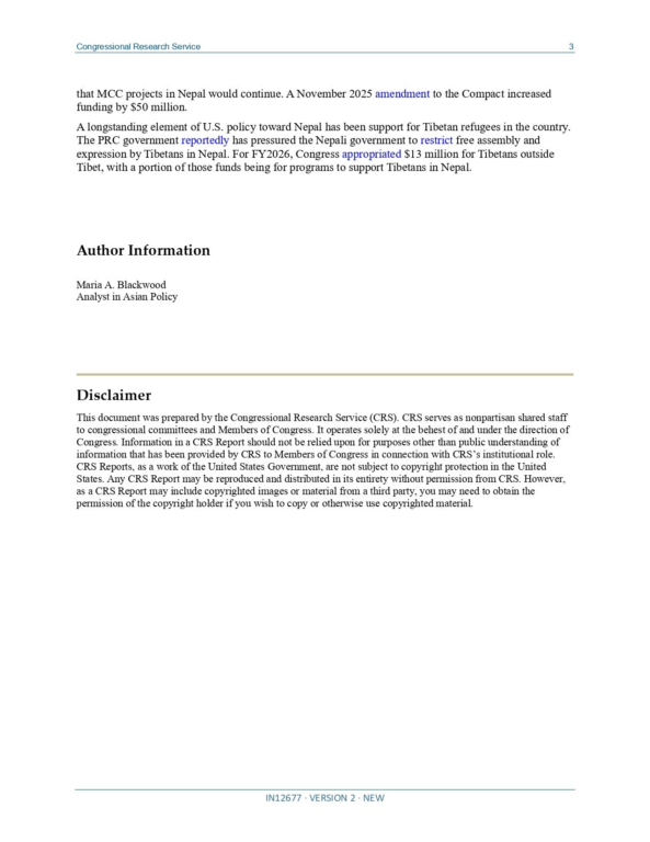 सीआरएस अमेरिकी संसदको अनुसन्धान सेवा हो । यसले कंग्रेसका समितिहरू र कंग्रेसका सदस्यहरूलाई निष्पक्ष एवं साझा संस्थाको रूपमा सेवा प्रदान गर्दछ । यो पूर्ण रूपमा कंग्रेसको निर्देशन र आदेशअनुसार मात्र सञ्चालन हुन्छ । नेपाल सम्बन्धी यो रिपोर्ट लेखक एसिया नीति सम्बन्धी विश्लेषक मारिया ए ब्ल्याउडले तयार पारेकी हुन् ।