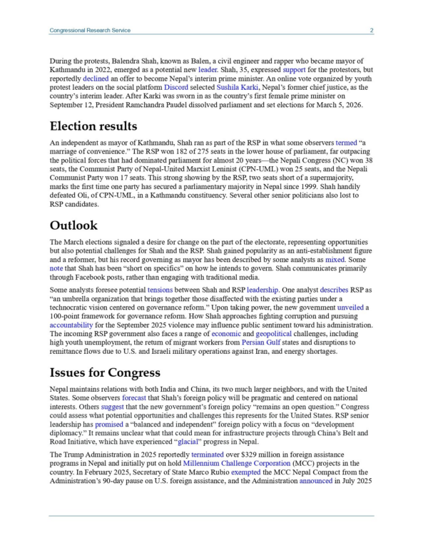 काठमाडौं । नेपालमा हालैको राजनीतिक परिवर्तनलाई लिएर एक रिपोर्ट सार्वजनिक भएको छ । कंग्रेसनल रिसर्च सर्भिस (सीआरएस) नामक अमेरिकी संस्थाले जेनजी आन्दोलनयताको राजनीतिक गतिविधिको विश्लेषण सहित रिपोर्ट सार्वजनिक गरेको हो ।