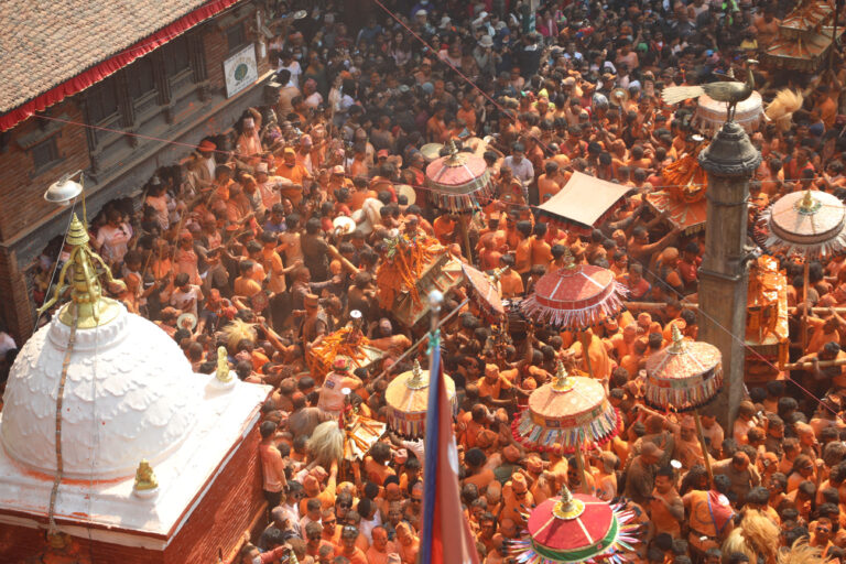 भक्तपुर, २ वैशाख । मानिसको भीड, भीडमा सबैको टाउको अनुहार, शरीर सबै फुस्रो अबिरैअबिरले राताम्मे । अगाडि हातहातमा धपक्क बलेको चिरागका समूह, त्यसपछि धिमे र मुस्या बाजा बजाउने अर्को समूह, त्यसपछि आआफ्ना टोलका देवीदेवतालाई विराजमान गराइएका खट बोकेर टोलटोल घुम्दै बालबालिका, युवायुवतीदेखि ज्येष्ठ नागरिकसमेत बिहानै जात्राको भीडमा सिन्दुर खेल्दै रमाउँदै आज भव्य रूपमा मध्यपुरथिमिका बासिन्दाले सुथसिया अर्थात् बिहानीको जात्रा मनाएका छन् ।