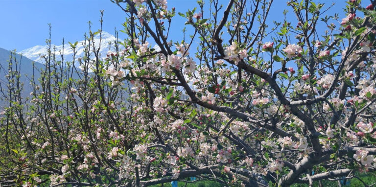 मुस्ताङ, ३ वैशाख । यहाँको स्याउ बगैँचा सेताम्मे भएका छन् । बगैँचाभित्रको स्याउका बोटहरू फुलेर सेताम्मे हुँदै जान थालेका हुन् ।