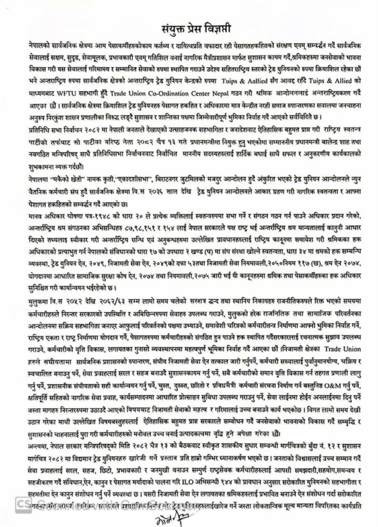 बिहीबार संयुक्त प्रेस विज्ञप्ति जारी गर्दै उनीहरूले सरकारको उक्त कदम अलोकतान्त्रिक र अन्तर्राष्ट्रिय श्रम कानुनविपरीत रहेको भन्दै निर्णय फिर्ता लिन माग गरेका हुन् ।
