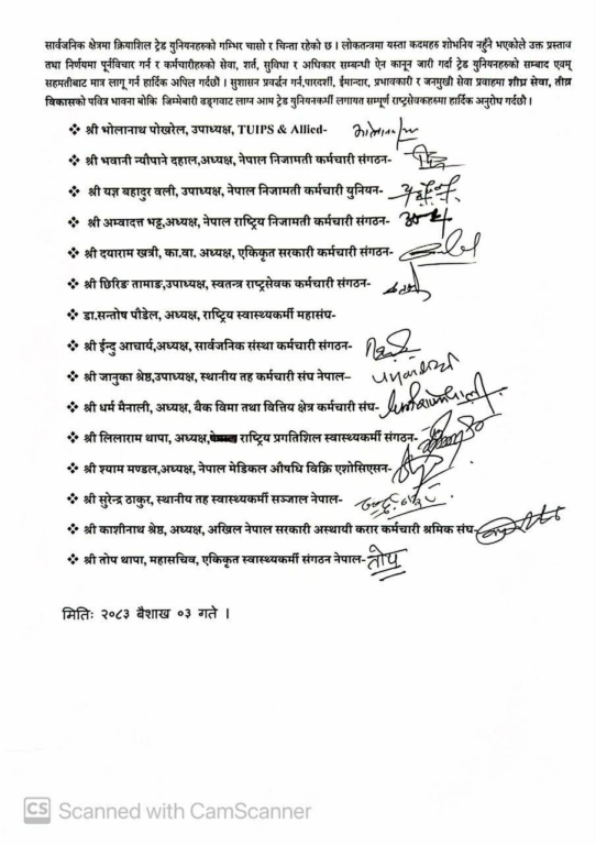विज्ञप्तिमा भनिएको छ, ‘सरकारले सुशासन प्रवर्द्धन गर्ने नाममा ट्रेड युनियन जस्तो लोकतान्त्रिक खम्बालाई भत्काउन खोज्नु शोभनीय छैन । कर्मचारीहरूको सेवा, शर्त, सुविधा र अधिकारसम्बन्धी ऐन कानुन जारी गर्दा ट्रेड युनियनहरूसँगको संवाद र सहमतिबाट मात्र लागू गर्न हामी हार्दिक अपिल गर्दछौँ ।’