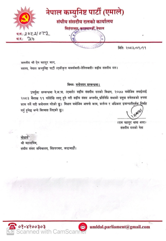 ‘नेकपा (एमाले) संघीय संसदीय दलको विधान २०७७ बमोजिम तपाईंलाई २०८३ वैशाख ११ गतेदेखि लागू हुने गरी संघीय संसद अन्तर्गत प्रतिनिधि सभाको प्रमुख सचेतकको रूपमा काम गर्ने गरी मनोनयन गरेको छु,’ दल नेता बादलले जारी गरेको विज्ञप्तिमा भनिएको छ।