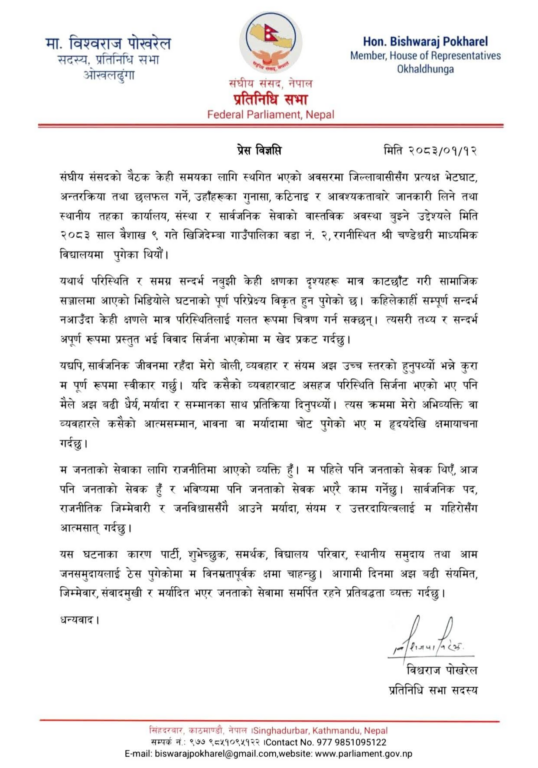 ओखलढुंगा । प्रतिनिधिसभा सदस्य विश्वराज पोखरेलले सामाजिक सञ्जालमा सार्वजनिक भएको एक विवादास्पद भिडियोप्रति क्षमायाचना गरेका छन् ।