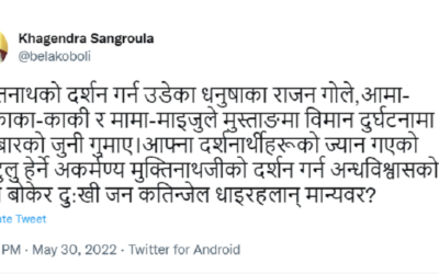 काठमाडौं, १६ जेठ । चर्चित लेखक खगेन्द्र संग्रौलाले तारा एयरको विमान दुर्घटनामा परेका धनुषाका राजन