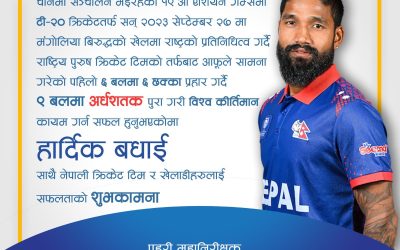 काठमाडौं,१४ असोज । चीनमा जारी १९औं एसियाली खेलकुदअन्तर्गत गत बुधबार भएको मंगोलियाविरुद्धको खेलमा बिष्फोटक ब्याटिङ