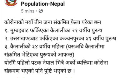 चैत २२, काठमाण्डौ । नेपालमा एकै दिन कोरोनाको नयाँ ३ जना संक्रमित भेटिएका छन् ।