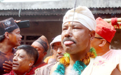 भक्तपुर, बैशाख ३ । भक्तपुरको बिस्केट जात्राअन्तर्गत मध्यपुर थिमिस्थित बोडेको जिब्रो छेड्ने जात्रामा बिहीबार बुद्धकृष्ण