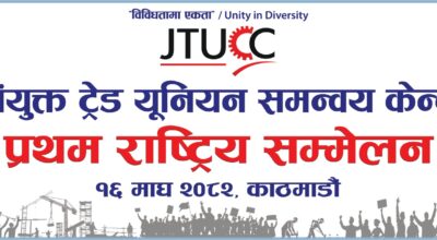 काठमाडौं, १५ माघ । संयुक्त ट्रेड युनियन समन्वय केन्द्र (जेटियुसिसी) को प्रथम सम्मेलन हुने भएको