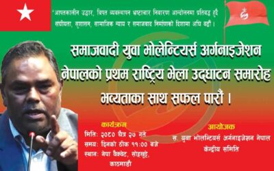 काठमाडौं, २६ चैत । जनता समाजवादी पार्टी (जसपा) नेपालनिकट समाजवादी युवा भोलेन्टियर्स अर्गनाइजेसनको राष्ट्रिय भेला