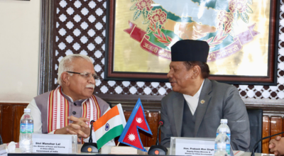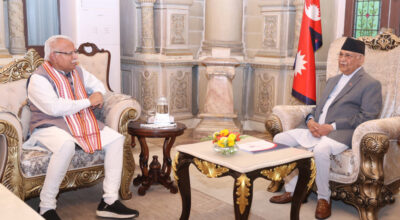 काठमाडौँ, १० वैशाख । प्रधानमन्त्री केपी शर्मा ओलीसँग भारतका विद्युत्, आवास तथा सहरी मामिलामन्त्री मनोहरलाल