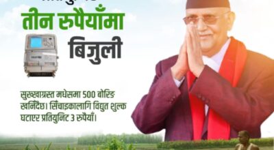 काठमाडौं, १४ साउन । प्रधानमन्त्री केपी शर्मा ओलीले अबदेखि सिचाईंको लागि प्रतियुनिट तीन रुपैयाँमा बिजुली