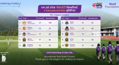 काठमाडौं : एनसेल फाउन्डेसनले बिहीबारसम्म खेलिएका नेपाल प्रिमियर लिग (एनपीएल) सिजन २ का खेलहरुमा हानिएका