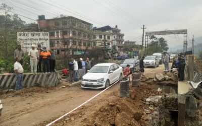 मलेखु, १९ वैशाख । पृथ्वी राजमार्गको धार्केमा पुलको छेउमा जमिन भासिएर अवरुद्ध बनेको सडक खुलाउन