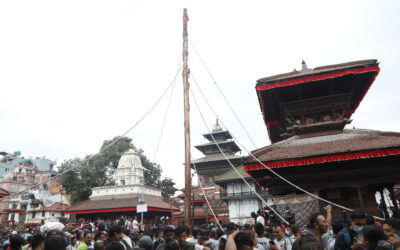 काठमाडौँ,२२ भदौ । इन्द्रजात्राको अवसरमा हनुमानढोका परिसरमा ३२ हातको योसिँ (३२ हातको लिङ्गो) ठड्याउँदै मानन्धर