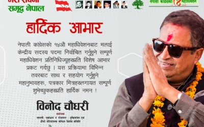 काठमाडौं, ६ पुस । व्यवसायी विनोद चौधरी नेपाली कांग्रेसको १४औं महाधिवेशनमा केन्द्रीय सदस्यमा निर्वाचित भएका