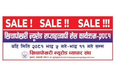 काठमाडौँ, ५ भदौ । काठमाडौँको खिचापोखरी न्यूरोड क्षेत्रको व्यवसाय प्रवर्द्धन गर्न सप्ताहव्यापी खिचापोखरी–न्यूरोड व्यापार मेला