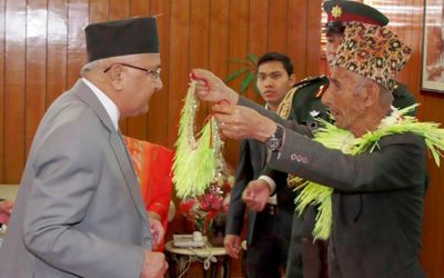 ९० वर्षीय पिताको हातबाट बाबुरामले लगाए टीका