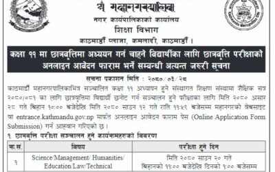काठमाण्डौ महानगरमा कक्षा ११ मा पढ्ने विद्यार्थीका लागि छात्रवृत्ति परीक्षाको अनलाइन आवेदन खुला