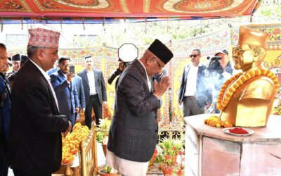एमाले अध्यक्ष ओलीद्वारा मनमोहन अधिकारीको सालिकमा माल्यार्पण