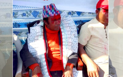 प्रतिस्पर्धीलाई एक लाख रुपैयाँको नोटको माला लाउँदै उम्मेदवारी फिर्ता