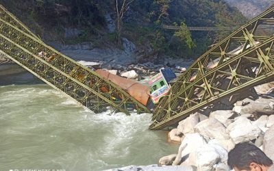 अरुण नदीको बेलिब्रिज भाँचियो, तीन ट्रक बीच पुलमै फसे