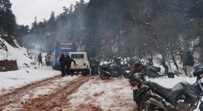 मध्यपहाडी लोकमार्गमा भारी हिमपात, दर्जनौँ सवारी र यात्रु अलपत्र