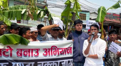 सडक निर्माणका लागि दबाब दिन सडकमै रोपियो केरा