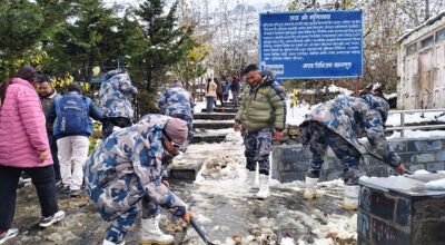 सुरक्षाकर्मीद्धारा मुक्तिनाथ मन्दिर परिसरको हिउँ पन्छ्याइयो