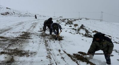 सडकको हिउँ पन्छाएर पदयात्रीलाई सहजीकरण गर्दै सशस्त्र प्रहरी