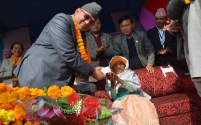 गृहमन्त्रीद्वारा ज्येष्ठ नागरिक भगवतीदेवी भण्डारीलाई राष्ट्रिय परिचयपत्र हस्तान्तरण