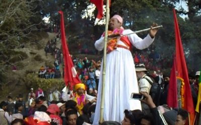 डोटी जिल्लाको बडिकेदार मेलामा मान्छेको काँधमा चढेर धामी काप्दै ।