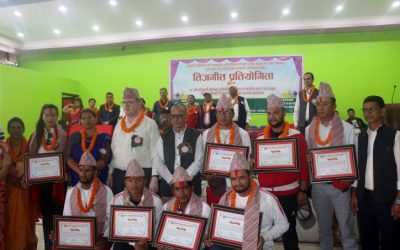 प्याराग्लाइडिङका खेलाडीलाई पोखरा महानगरपालिकामा सम्मान गरेपछि सामूहिक तस्बिर खिचाउँदै