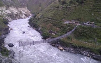 डोल्पाको त्रिपुरासुन्दरी नगरपालिकाको सिँउरेनी बस्ती र फोई बस्तीकोबीचमा भीरबाट खसेको ढुङ्गा लागेपछि चुँडिएको झोलङ्गे पुल ।