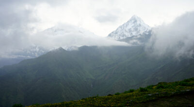 तिरी गाउँबाट देखिएको पर्वतीय शृङ्खला र पृष्ठभूमिमा निलगिरि हिमाल