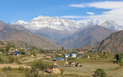 ताकम गाउँ र पृष्ठभूमिमा देखिएको गुर्जा हिमाल