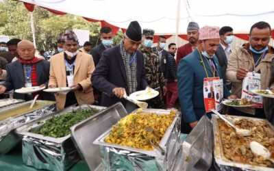 भृकुटीमण्डपमा लाइनमा बसेर खाना लिँदै प्रधानमन्त्री देउवा