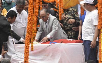 प्रधानमन्त्री दाहालद्वारा सुवास नेम्वाङप्रति राष्ट्रिय झण्डा ओढाएर अन्तिम श्रद्धाञ्जली अर्पण