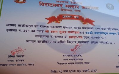 ७०औं अन्तरास्ट्रिय भन्सार दिबसमा के एल दुगड समुहका श्याम सुन्दर कनोडिया सम्मानित
