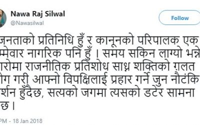 अज्ञातस्थलबाट नवराज सिलवालको टुइट, “सरकारले विपक्षीलाई प्रहार गर्न नौटंकी देखायो”