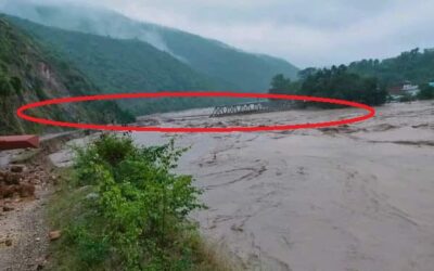 सुनकोशीमा आएको बाढीले रामेछाप र सिन्धुली जोड्ने खुर्कोटको पुल बगायो