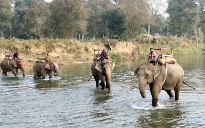 चितवनको सौराहास्थित बाघमारामा हात्तीसँग रमाउँदै पर्यटक
