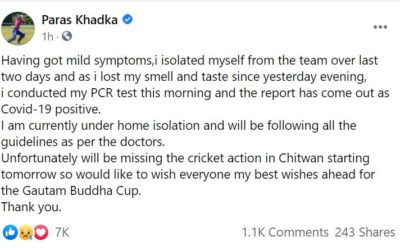 पूर्व कप्तान पारसलाई कोरोना : गौतम बुद्ध कपमा खेल्न नपाउने