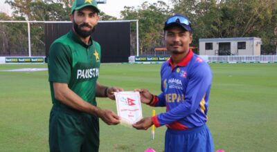 नेपाल र पाकिस्तान शाहिन्सबीचको खेल सुरु, पहिले बलिङ गर्दै नेपाल
