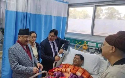गृहमन्त्री श्रेष्ठलाई भेट्न बाँसबारी पुगे प्रधानमन्त्री प्रचण्ड, एन्जियोप्लास्टी गरिएका श्रेष्ठको स्वास्थ्य अवस्था स्थिर