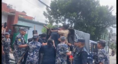 प्रधानमन्त्री निवासको मूल गेटमा नेविसंघ आन्दोलित, घन्कियो नालायक सरकार मुर्दावादको नारा